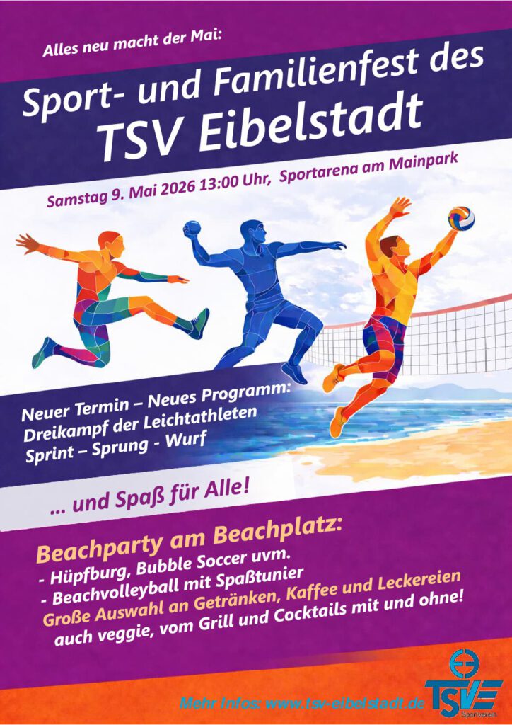Wir laden bereits am Samstag, den 9.5.2026, ab 14 Uhr Sportbegeisterte und ihre ganze Familie zum Sport- und Familienfest in die Sportarena am Mainpark ein. Neu ist auch der Start am Nachmittag mit dem Sportdreikampf, den wir dann gemeinsam in einer fröhlichen Abendveranstaltung am Beachplatz ausklingen lassen.